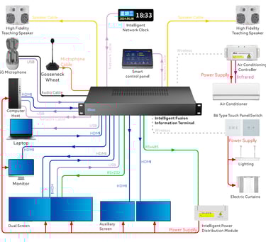 전력 증폭기 기능: 전력 증폭기를 통합하고 있으며, 이는 고품질 음향 분배를 보장하는 데 매우 중요합니다. 스마트 교실에서 명확한 음성은 효과적인 수업을 위해 필수적입니다. 선생님의 강의, 교육용 비디오 또는 음성 기반 학습 자료라면 어떤 것이든 통합 제어 장치(ICU) 내의 전력 증폭기는 음향 신호를 증폭합니다. 이로 인해 좌석 위치에 관계없이 모든 학생이 왜곡되거나 음량 불균형 없이 명확하게 소리를 들을 수 있습니다. 예를 들어, 듣기 이해가 강조되는 언어 학습 수업에서 음성 자료의 정확한 증폭은 학생들이 언어 기술을 향상시키는 데 도움이 됩니다.