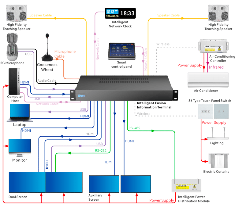 IP 기반 인터콤: ICU의 제어 패널에는 IP 기반 인터콤 시스템이 장착되어 있습니다. 이 기능을 통해 교실 내부 및 외부와 원활한 통신이 가능합니다. 선생님은 별도의 통신 장치를 사용하지 않고도 학교 사무실, 기술 지원 팀 또는 심지어 다른 교실과 통신할 수 있습니다. 긴급 상황, 예를 들어 갑작스런 기기 고장이나 안전 문제가 발생했을 때 인터콤은 빠르고 효율적인 도움 요청 수단을 제공합니다.
